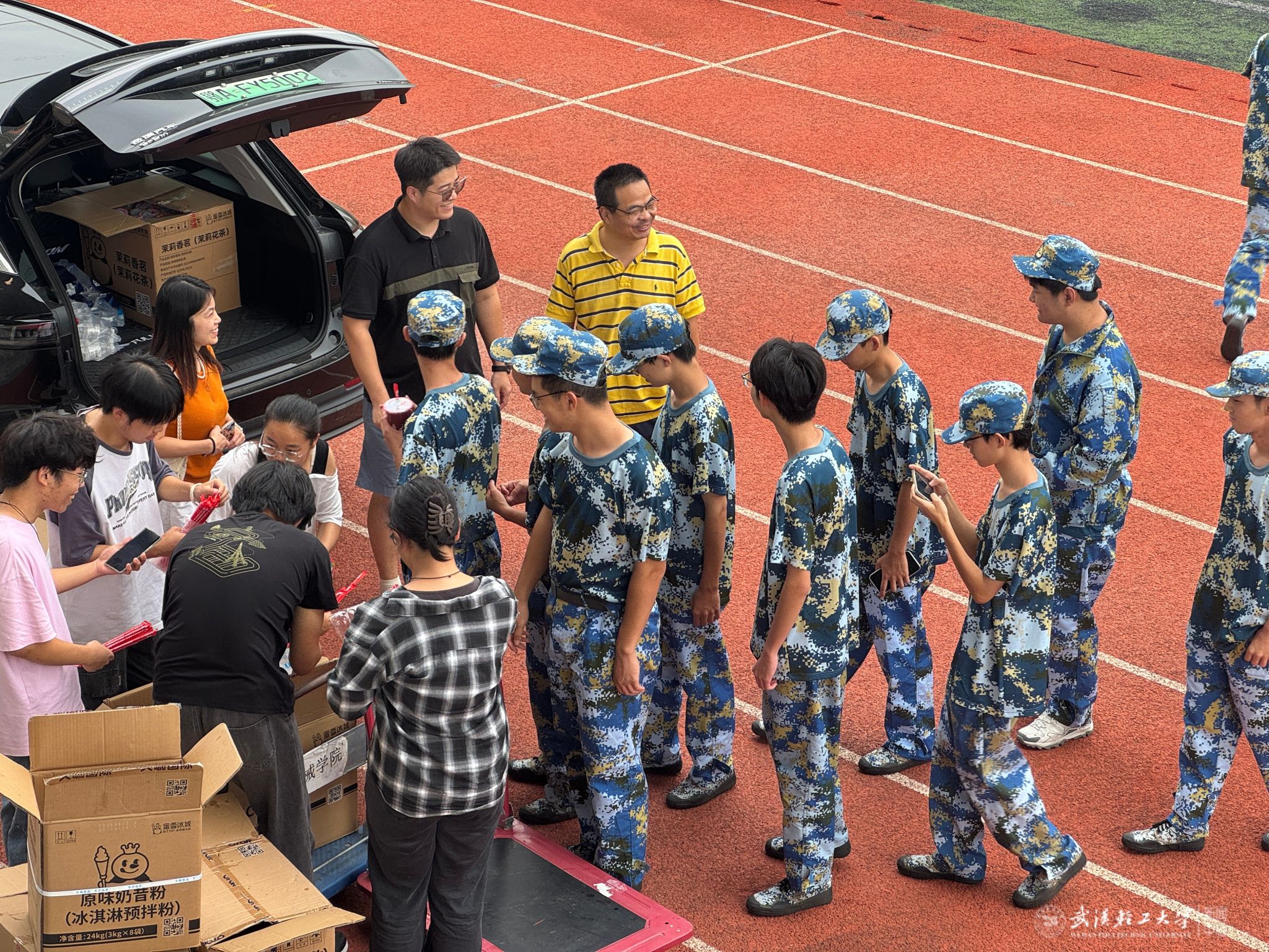 本网讯 烈日下的军训场,军姿挺拔如松,口号铿锵有力。近日,机械学院军训场地内上演了一幕暖心场景:学院党委副书记何伟代表学院,联合武汉市无界环球文化传播有限公司,为正在刻苦训练的2025级新生送上香甜的奶茶,用实际行动传递关怀与暖意。